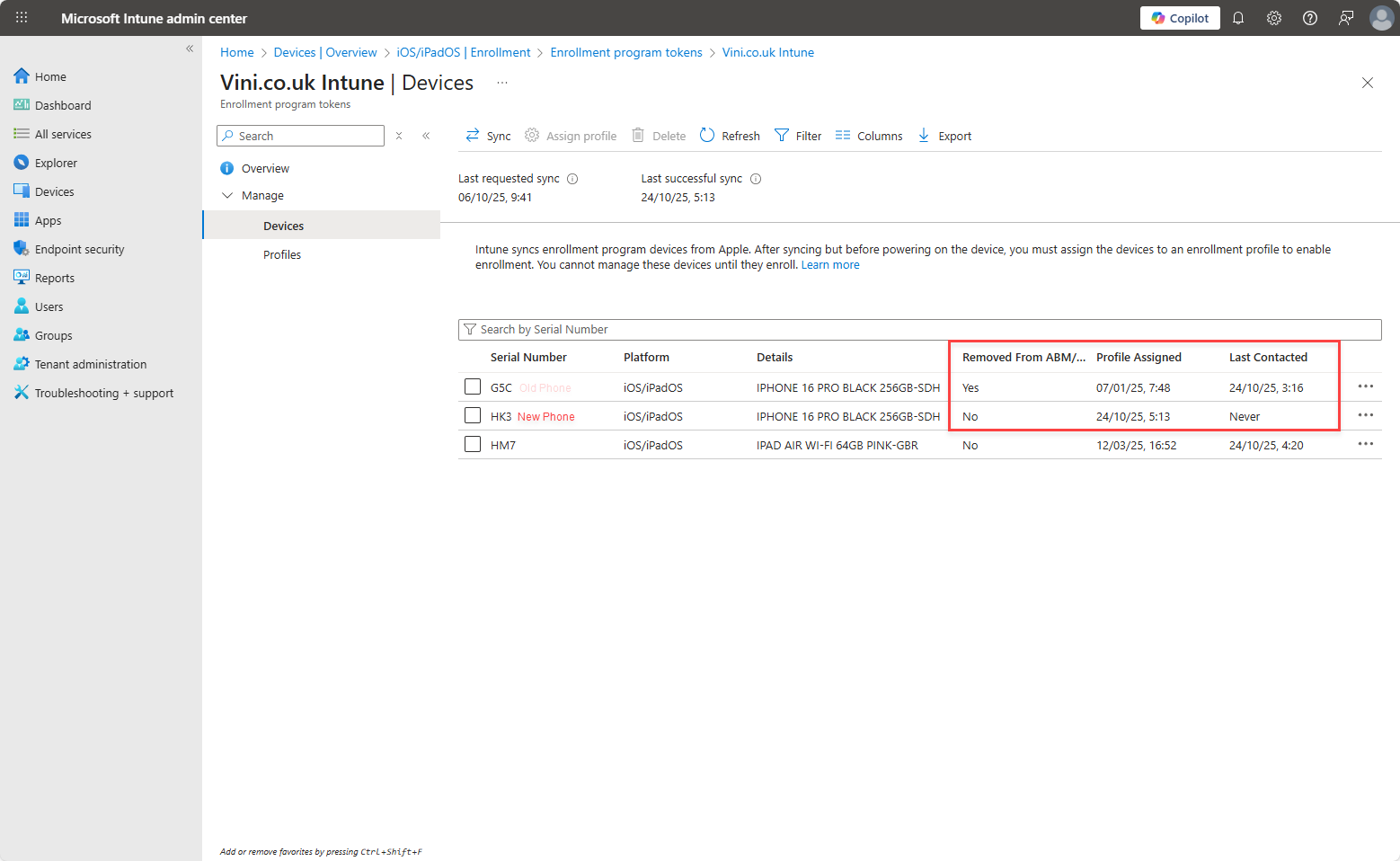Again, everything happens automatically. You turn on the new phone, and you’ll be prompted to enrol into Device Management. From this image, you’ll see the old phone has been removed from ABM. The only thing you will need or want to do, when ready, is remove the Device Object from Intune to keep your data tidy and up to date.