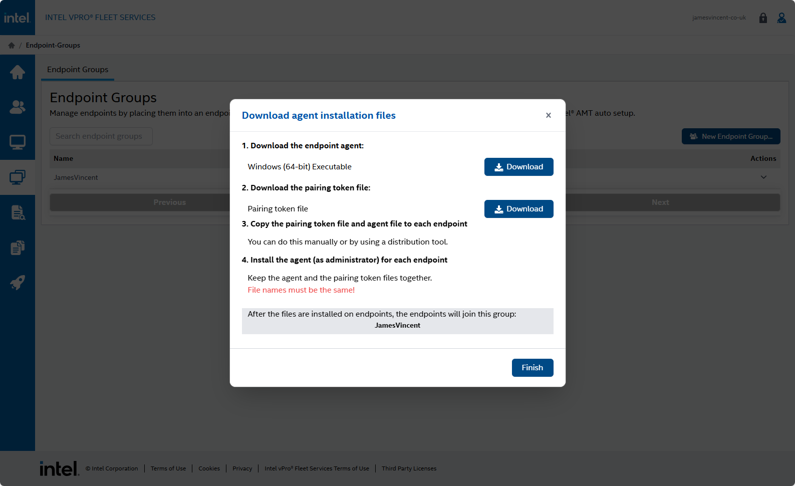 The Endpoint Agent is an MSI Installer. Alongside this, is a pairing token file, i.e. a token which links the MSI Installer back to your Intel vPro® Fleet Services console. Just ensure the token lives in the same directory as the MSI and all the magic will happen automatically.
