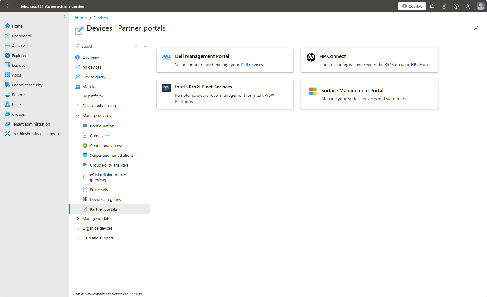 Well, as long as there’s a User within the Intel vPro® Fleet Services console that has the same email address as that of your EntraID account, that you use to administer Intune, you simply browse to Devices from the Intune portal, click on Partner Portals towards the bottom of the menu, and click on Intel vPro® Fleet Services. A B2C connection will automagically be made, taking you directly into the Intel vPro® Fleet Services console.